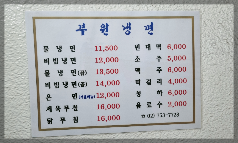 부원면옥은 남대문시장 한복판 골목 안에 있어요. 초행이라면 입구를 살짝 지나칠 수도 있는데, **“2층으로 올라가는 좁은 계단”**이 포인트! 매장 입구엔 ‘백 년 가게’, ‘블루리본’, ‘식신 인증’ 등 다양한 스티커와 인증서가 붙어 있었고요, 벽에는 방송 출연 사진들과 유명인들의 사인도 가득. 1960년부터 50년 넘게 영업 중인 전통 평양냉면집이라는 자부심이 느껴졌어요.
