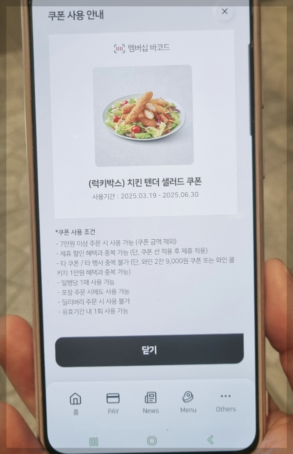 (여기 사진 삽입: 치킨 텐더 샐러드 사진 + 쿠폰 화면 사진)